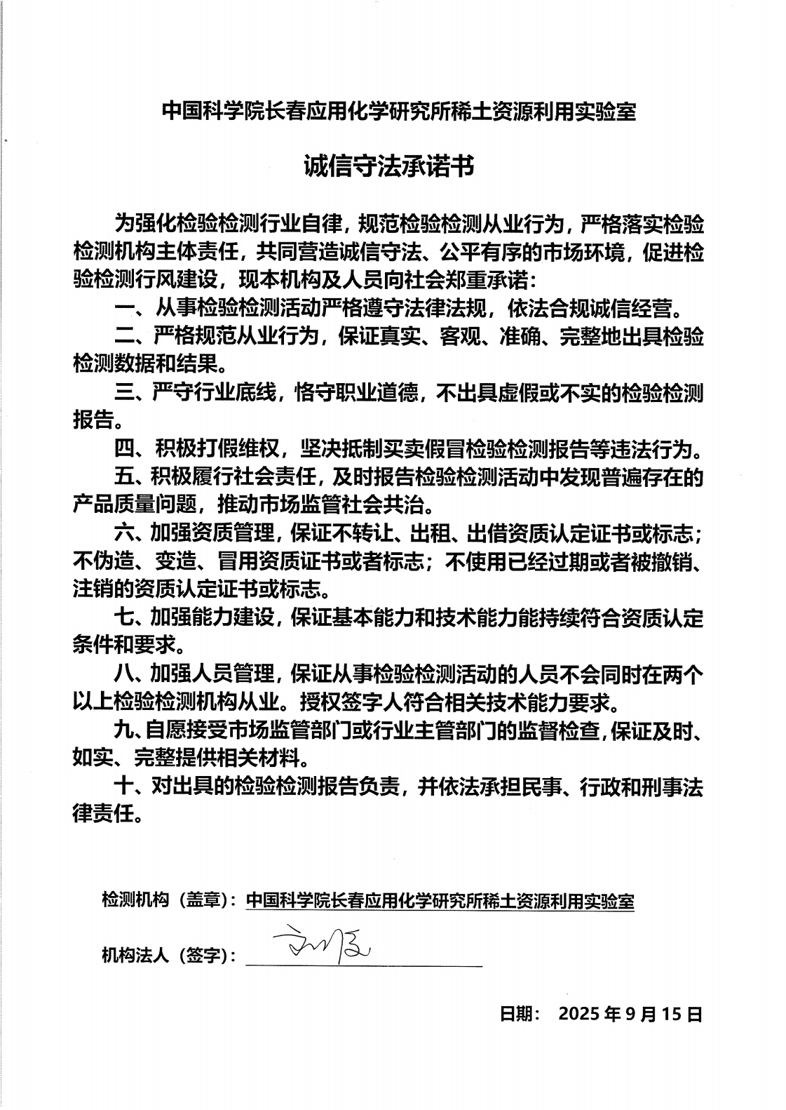 中国科学院长春应用化学研究所稀土资源利用实验室由稀土资源利用国家重点实验室支持,旨在实现对科研的精确服务,提升科研机构在检验检测方面服务社会的能力。实验室以“行为公正、方法科学、结果准确、服务完整、及时诚信”为方针,自2015年底设立起即严格贯彻规范的运行和管理制度。经过扎实的准备,于2017年6月向中国认证认可监督管理委员会提交检验检测机构资质认定初次申请。申请材料经认监委审核后,委派中国科学院评审组组织专家进行评审,于2017年7月4日至5日进行现场评审。依据国家质检总局2015年第163号令《检验检测机构资质认定管理办法》和《检验检测机构资质认定评审准则》,通过查验文件与记录,人员座谈与能力考核,现场检查与试验等形式,评审组对组织机构、管理体系、记录与报告和检测项目等进行了考核评定。专家评审组认为,实验室编订的《质量手册》、《程序文件》、《作业指导书》以及相应的各种记录表格等,符合《检验检测机构资质认定管理办法》和《检验检测机构资质认定评审准则》的条款规定;控制范围覆盖了本室检验检测工作所涉及的全部内容;组织管理、实验室环境、仪器设备、量值溯源、人员素质、质量管理体系的运行达到检验检测工作的标准;检测机构申请的技术能力与检验检测机构的工作范围相适应,满足检验检测机构资质认定评审准则及其相关要求,建立的管理体系能够持续运行。2017年9月4日中国国家认证认可监督管理委员会正式颁发《检验检测机构资质认定证书》,即日起授权使用CMA标识,可向社会出局具有证明作用的数据和结果。